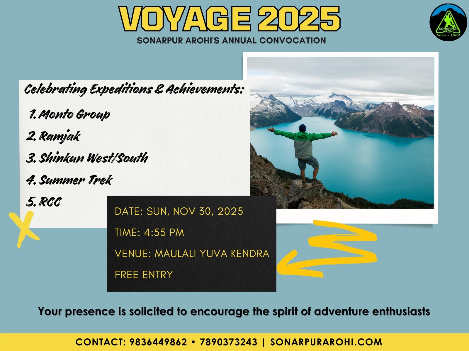 Voyage’ আমাদের বাৎসরিক অনুষ্ঠান। আমাদের সাফল্য, ব্যর্থতা এবং অগ্রগতির সমাবর্তন। সমস্ত অ্যাডভেঞ্চার এবং খেলাপ্রেমী মানুষকে ওই অনুষ্ঠানে আমন্ত্রণ জানাই।